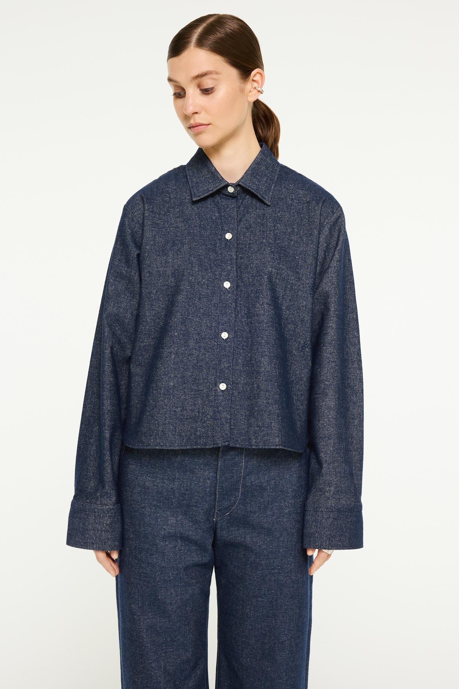 Norie is a cropped shirt in brushed Soft Denim fabric. The back pleat and rounded hemline give it a relaxed yet dressed look. The model is 173 cm tall and wearing a size S. Length of the garment: 57 cm (size S). Ref. 331527910