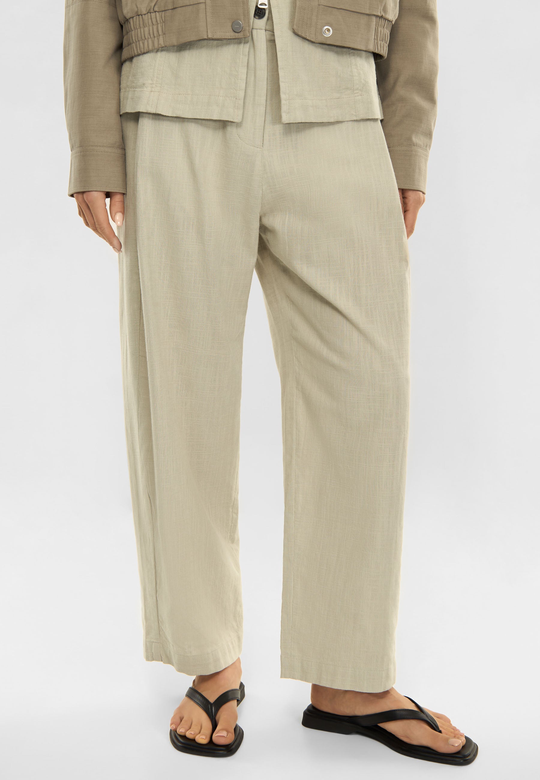 Sandi ist eine Hose aus Textured Weave – einem Baumwollstoff mit feiner Struktur und fließendem Fall. Die entspannte Passform und verkürzte Länge verleihen ihr eine moderne Silhouette.
