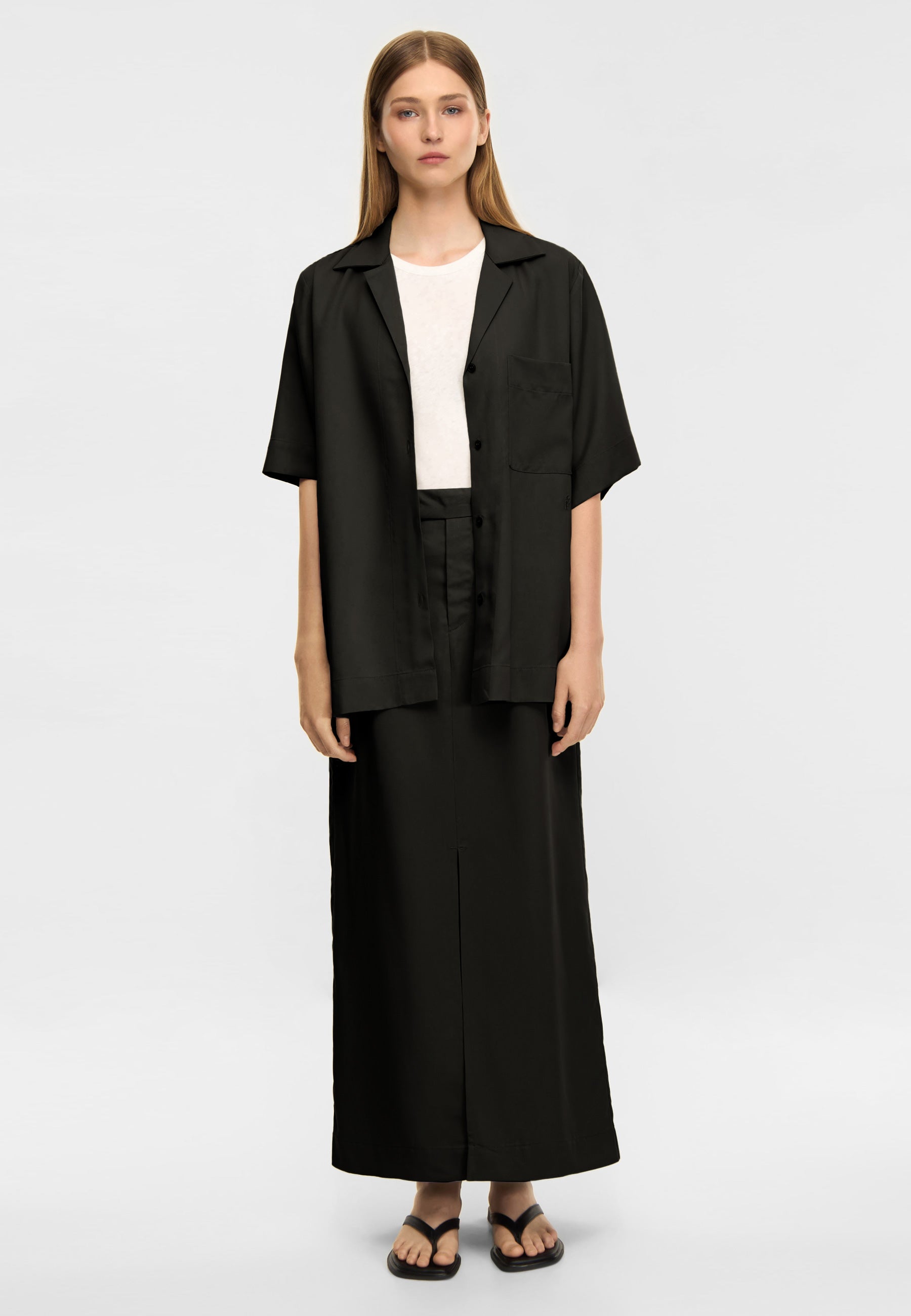 Diedona ist ein Rock aus Draped Twill Cly – einem weichen Lyocellstoff mit fließendem Fall und dezentem Glanz. Die gerade Silhouette sorgt für einen eleganten und zugleich entspannten Look, der sowohl im Alltag als auch zu festlicheren Anlässen funktioniert.